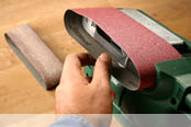 Spennarmen er lett å betjene, og brukes til å sette inn og skifte ut båndene. Trekk den helt ut. Avstanden mellom de to båndrullene minsker, og båndet er ikke lenger stramt. Ta nå av det gamle slipebåndet og skyv det nye jevnt inn over de to båndrullene. Om nødvendig kan du sentrere båndløpet manuelt med styrerullen. Med spennarmen trykker du nå de to båndrullene utover igjen. Slipebåndet sitter stramt med det samme, og båndsliperen er klar til bruk. |