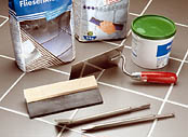 плитки, мастерок, гребенчатый шпатель или гребенчатый мастерок, крестовины, затирка для швов, затирочная доска и состав для удаления остатков затирки |