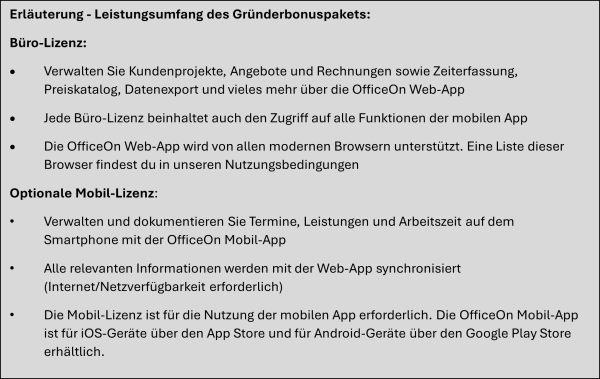 2.1. Der Gründerbonus umfasst die kostenlose Nutzung von OfficeOn für die Dauer von 6 (sechs) Monaten. Im Gründerbonus enthalten sind folgende Leistungen: